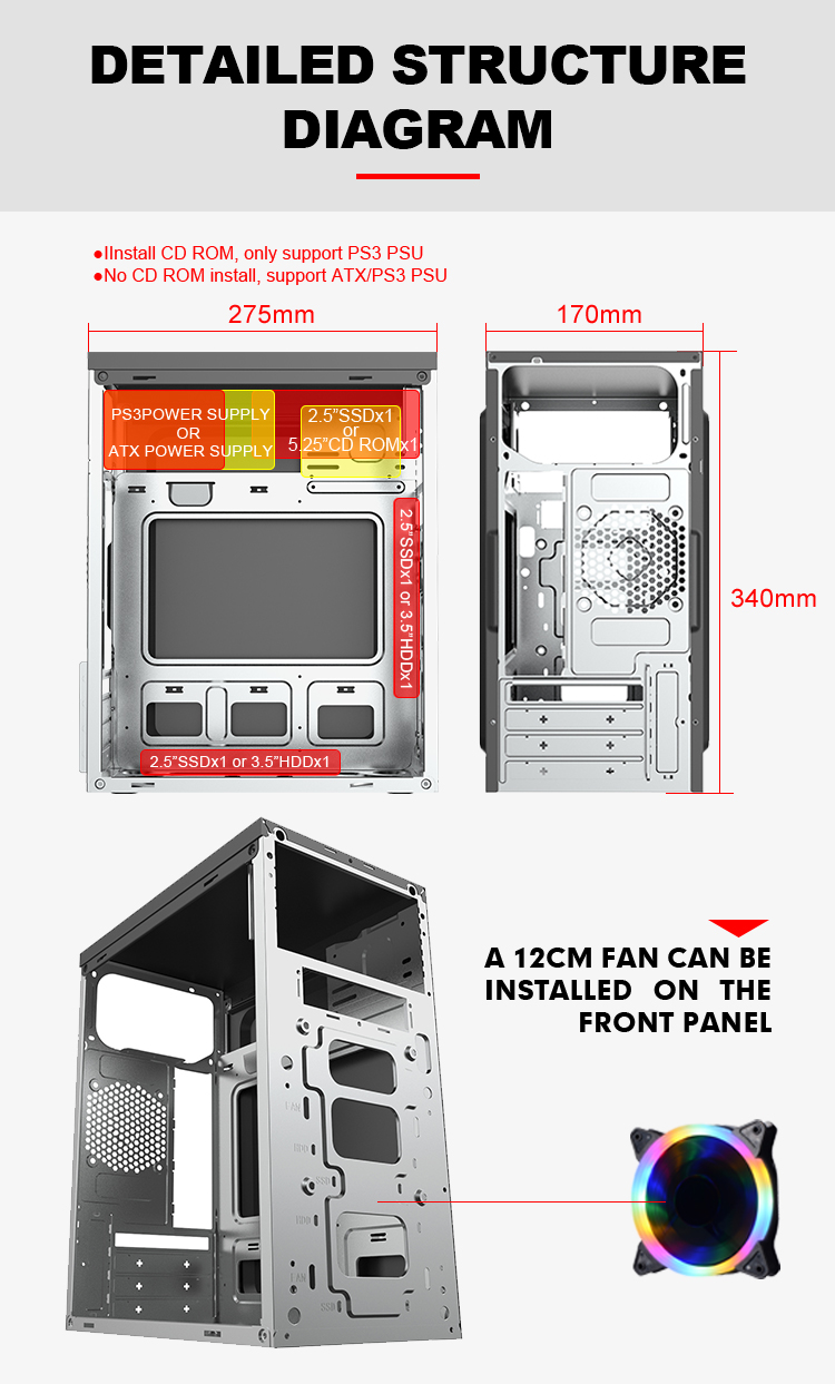 | HDD/SSD | 5.25”CD ROM*1+3.5”HDD*1+2.5”SSD*1 |
