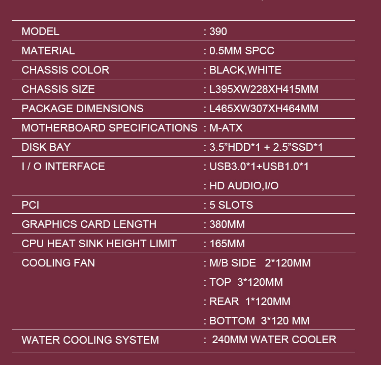 | Cooler Fan Support | front panel 3*120mm top 2*120mm rear 1*120mm |