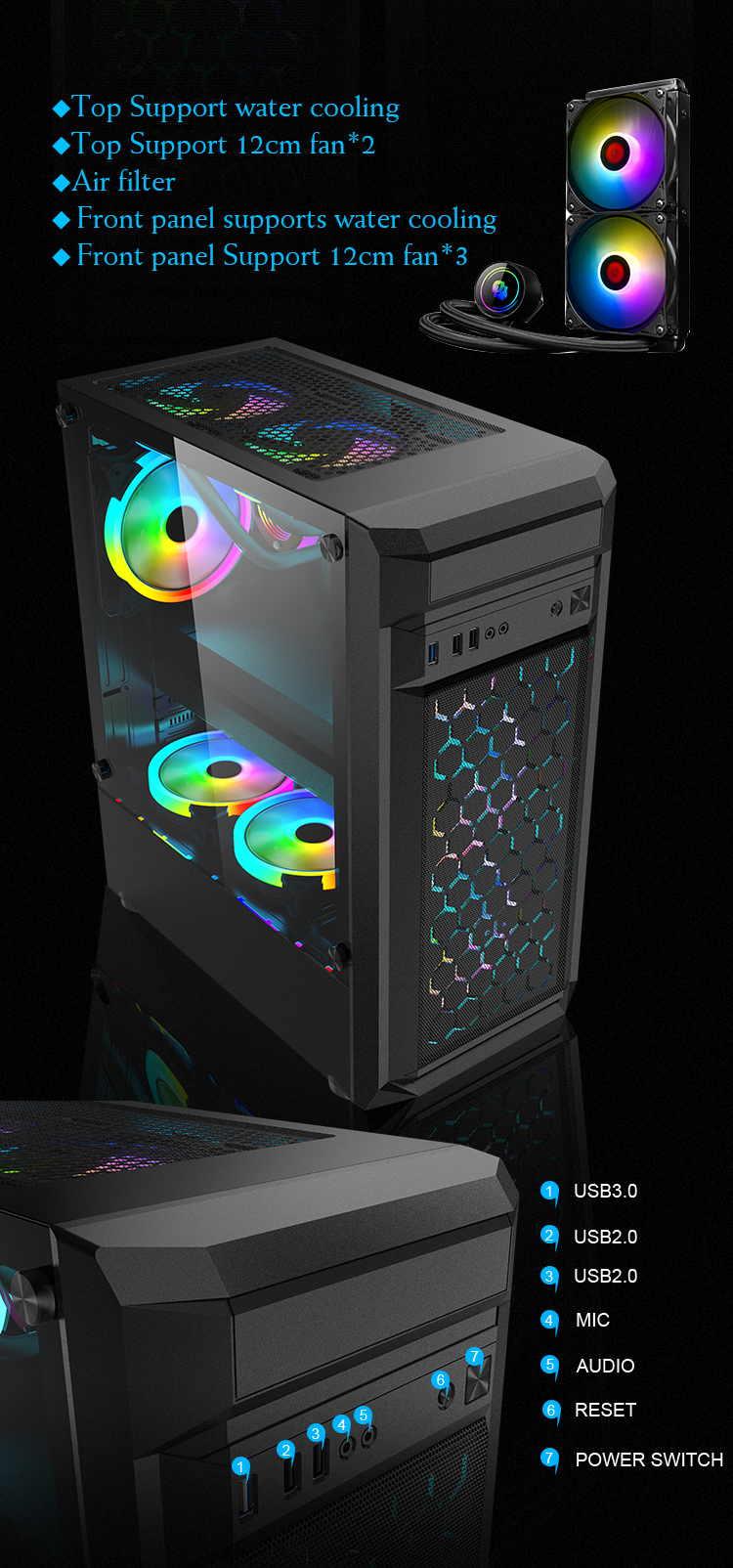 | Cooler Fan Support | front panel 3*120mm top 2*120mm Power support 2*120mm rear 1*120mm |