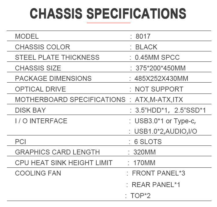 | USB I/O | 3.0*1+ 1.0*2+HD.AUDIO |